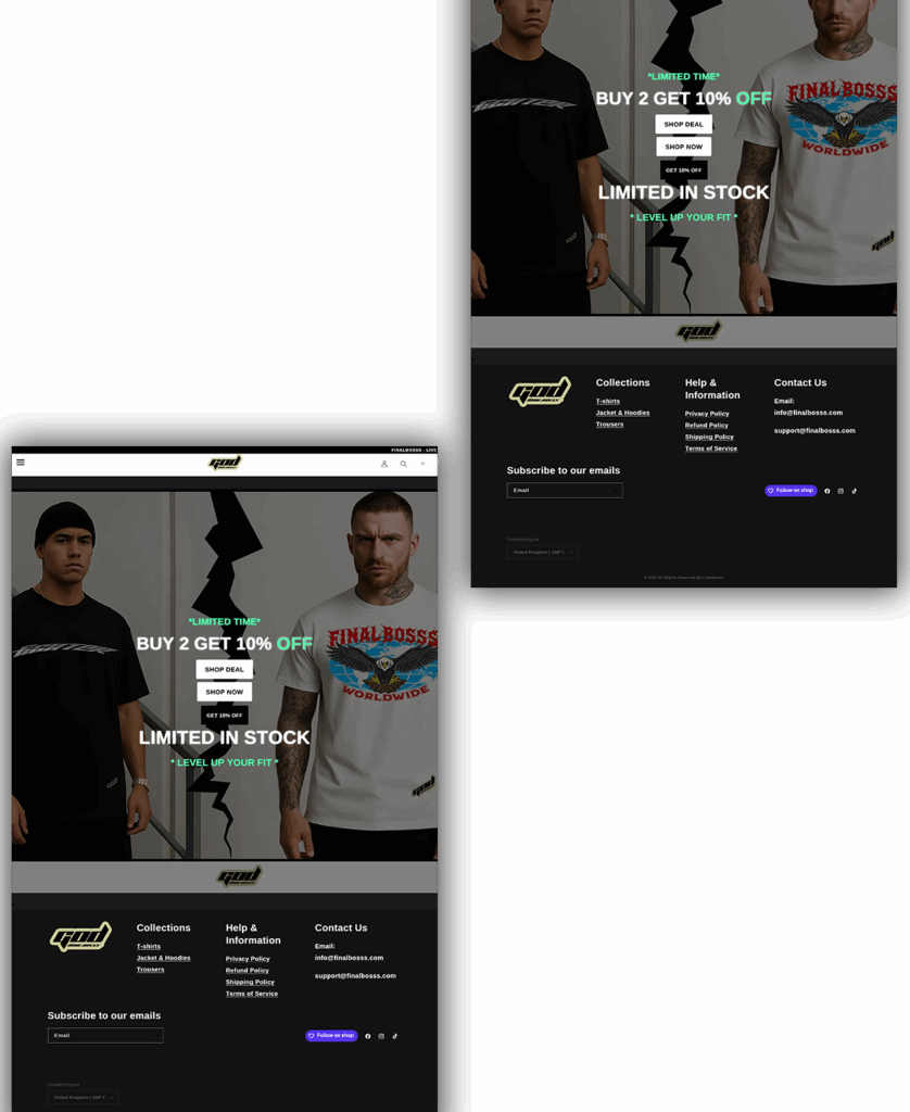 Final Bosss emerged in 2025 with a mission to fuse bold design with unapologetic confidence. Based in the UK and inspired by global street culture, the brand creates premium streetwear that empowers wearers to feel like the main character in their own story. With attention to detail and a boss-level attitude, Final Bosss has quickly become the go-to choice for go-getters, risk-takers, and anyone ready to move different.